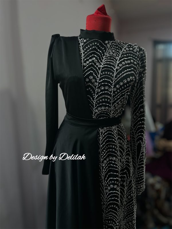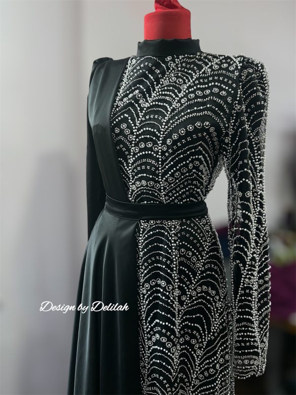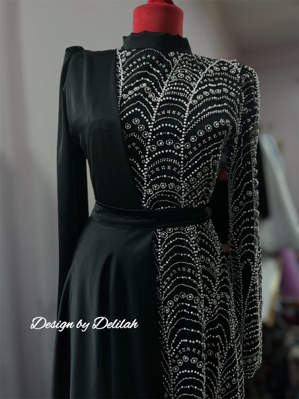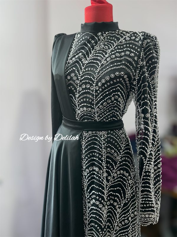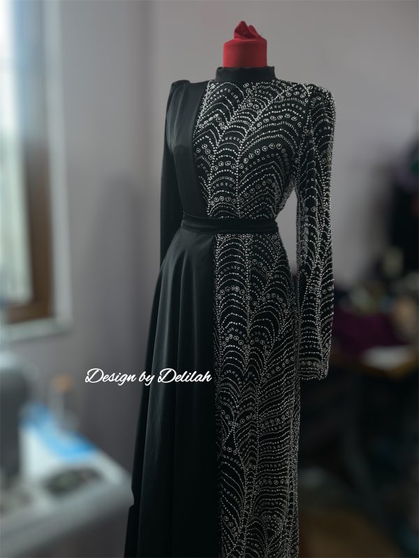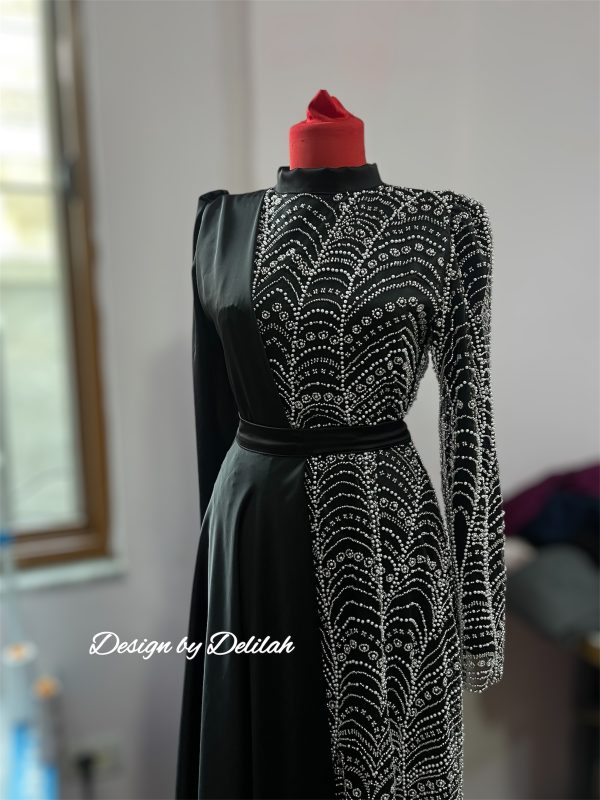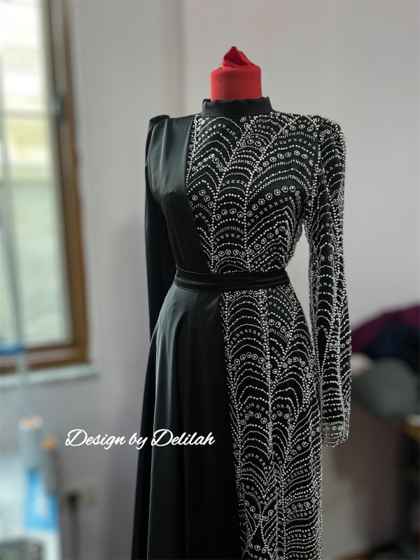 Fustan per evente, me bishtin material saten qe mund te vendoset ose te hiqet sipas deshires, Copa me gure dhe rruaza i japin elegancen qe duhet ketij fustani
