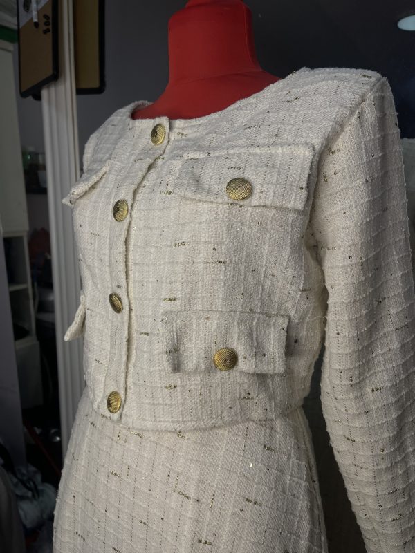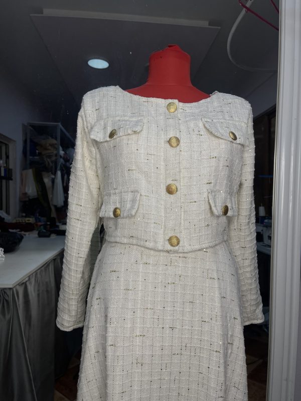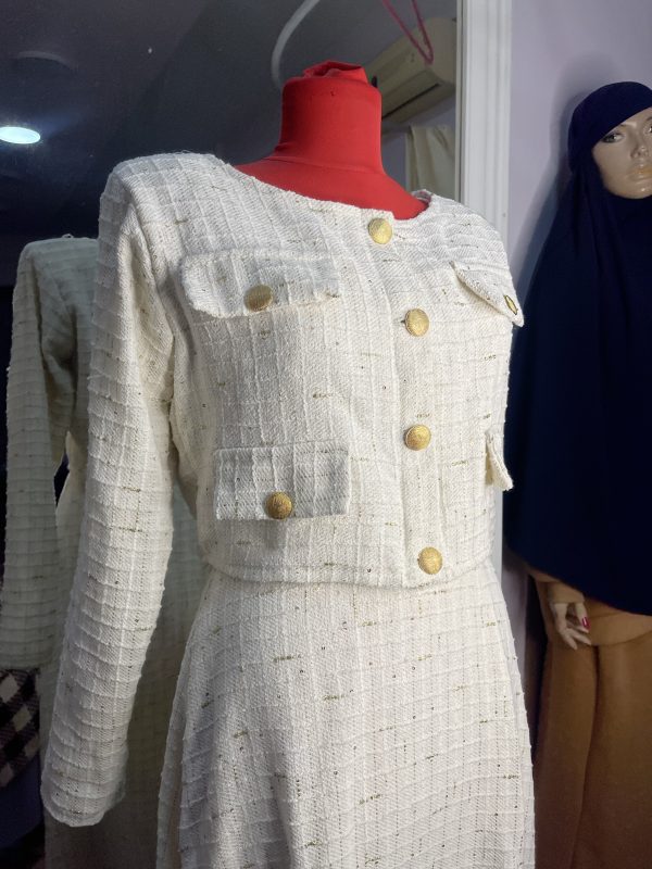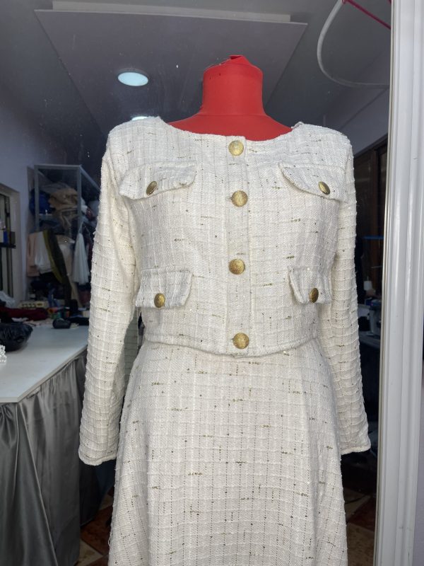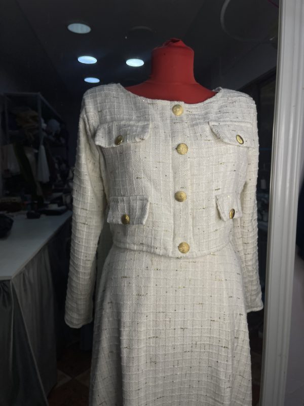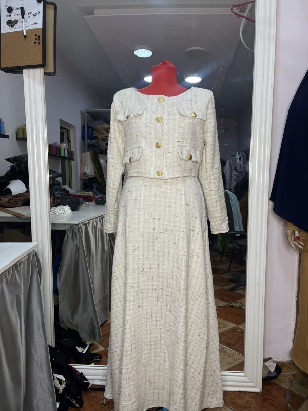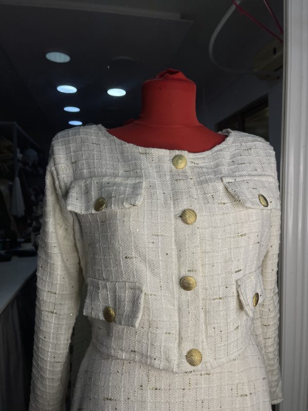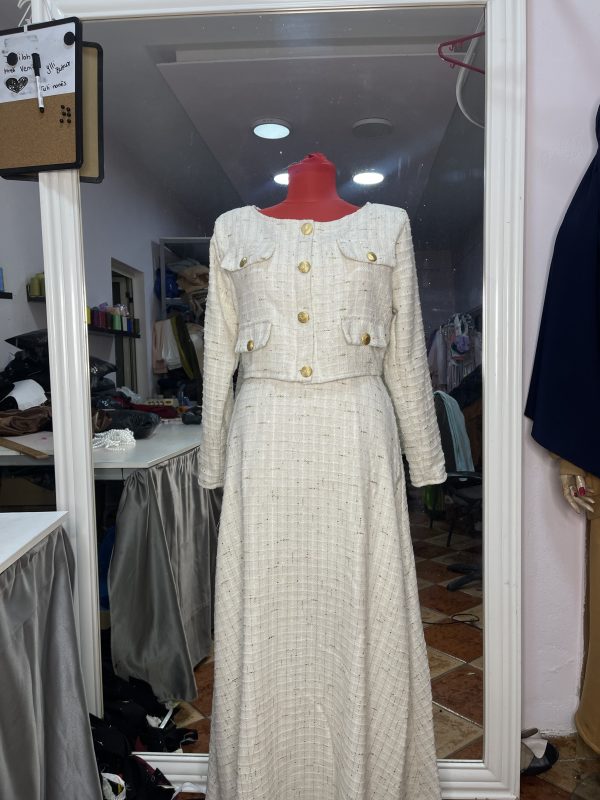 Zbuloni përkryerjen e klasit dhe stilit me „Kostum Channel“ – një set të rafinuar që përmbledh elegancën e një xhakete të shkurtër me kapakë xhepa dekorues dhe kopsa në ngjyrë ari, së bashku me një fund të lëmuar me astar, që përçon besueshmëri dhe sofisticim.