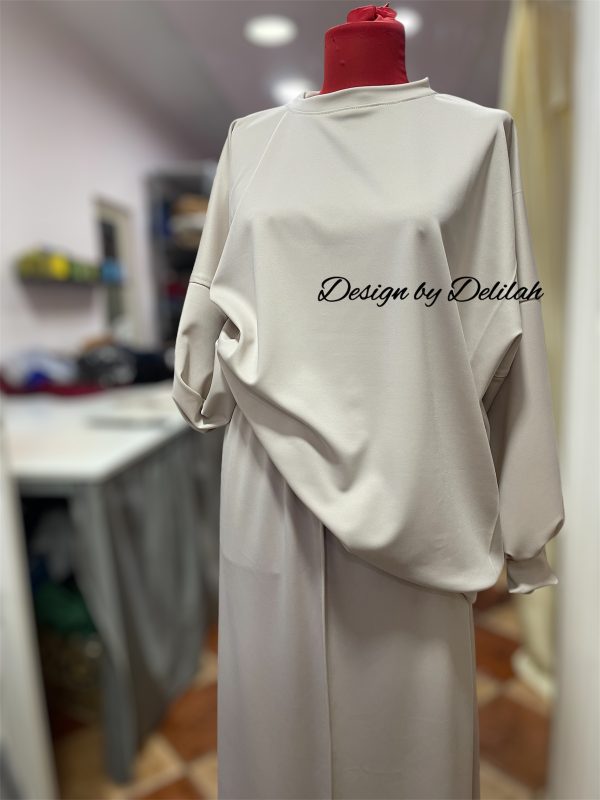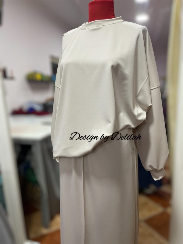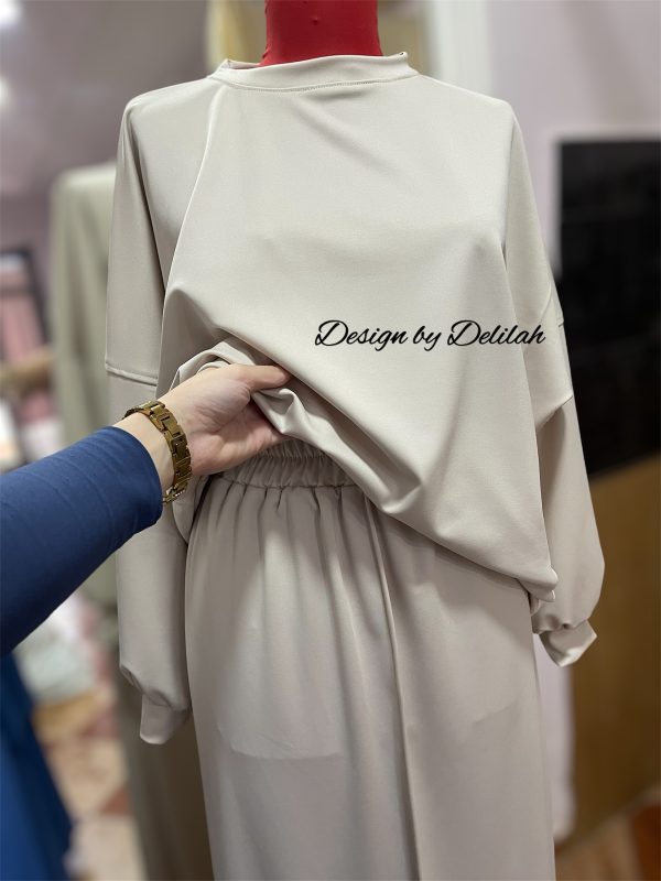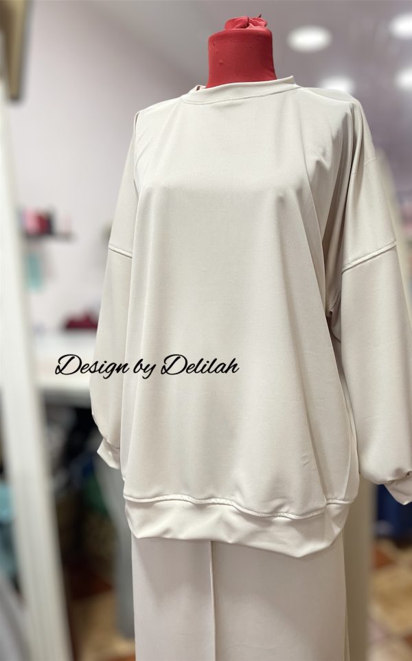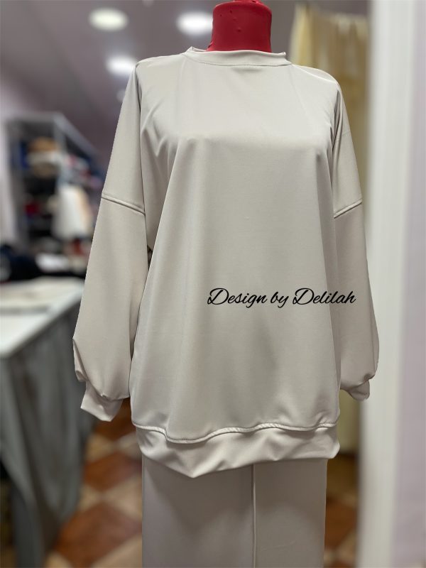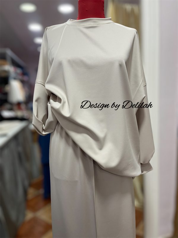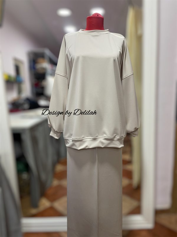 Ky set elegant dhe i rehatshëm përbëhet nga një bluzë oversize dhe një fund të harmonizuar me llastik tek beli — një kombinim që sjell stilin dhe komoditetin në një paketë të vetme.