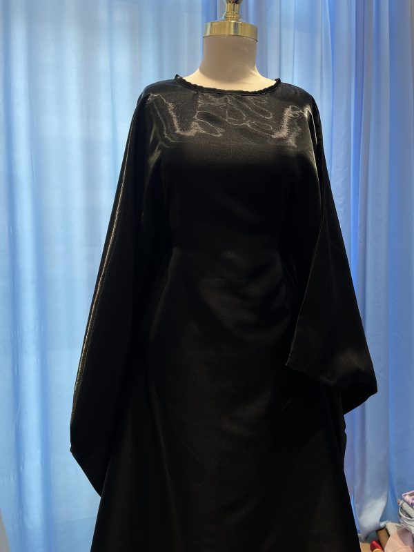 Me një prerje fluide që rrjedh natyrshëm mbi trup, dhe mëngë të gjera që krijojnë një siluetë të veçantë, ky model sjell një kombinim perfekt mes thjeshtësisë dhe luksit. Pëlhura me shkëlqim të lehtë reflekton dritën në mënyrë delikate, duke i dhënë fustanit një pamje elegante në çdo lëvizje.