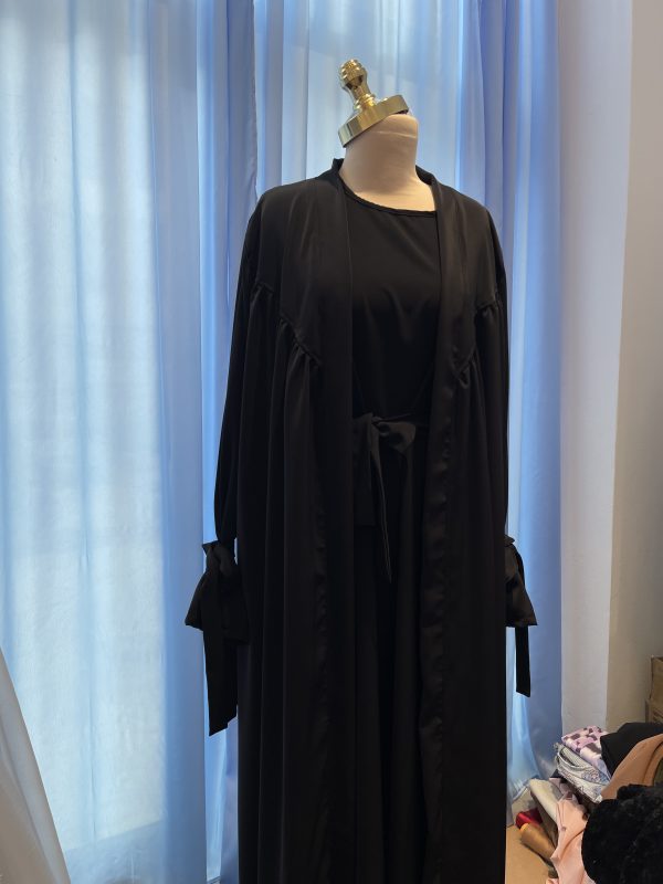 Ky set përbëhet nga një fustan i brendshëm minimalist dhe një abaya e hapur me prerje fluide, e cila shton dimension dhe lëvizje në çdo hap. Rripi në bel lejon përshtatje sipas dëshirës, duke theksuar lehtësisht siluetën pa humbur rehatinë.