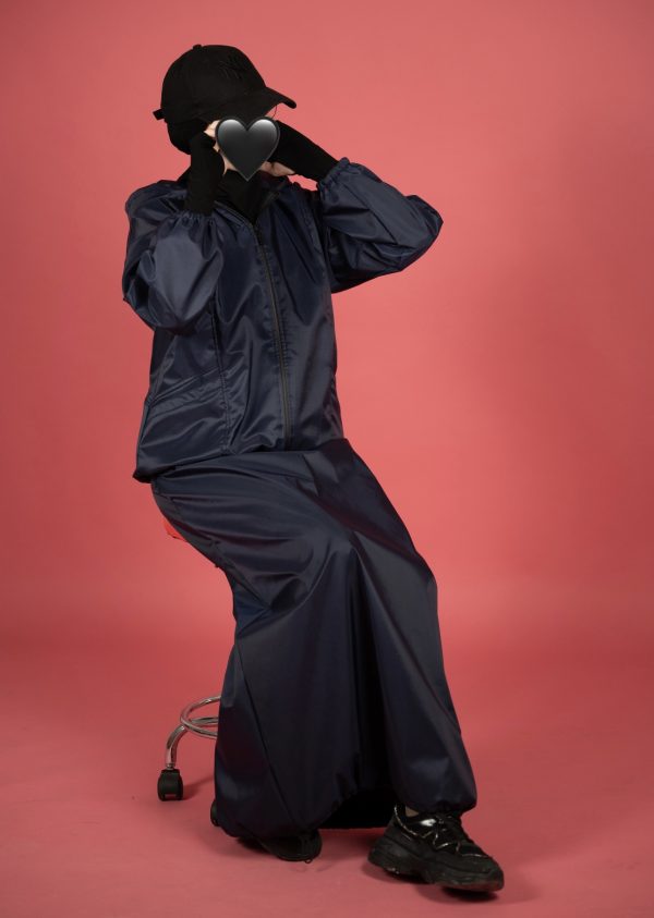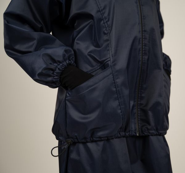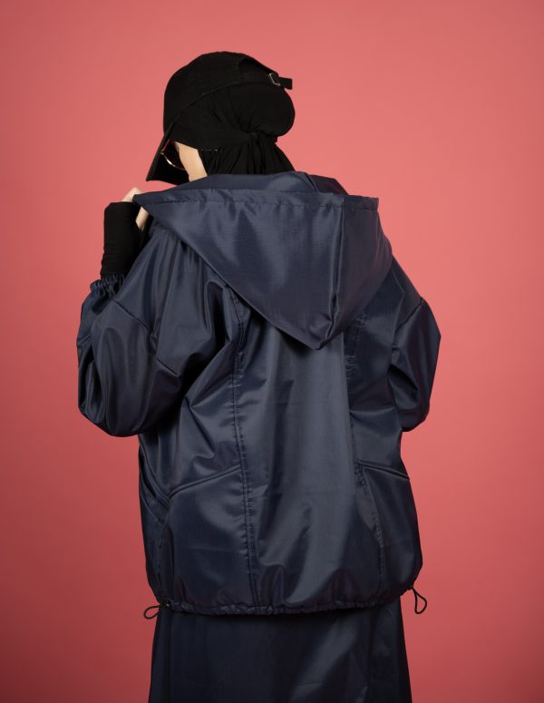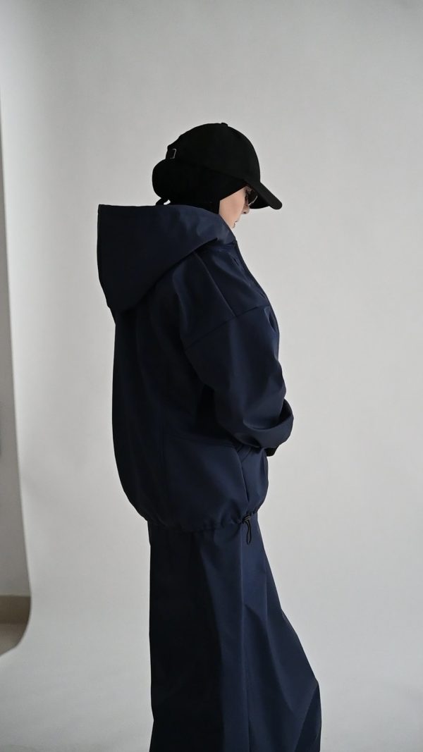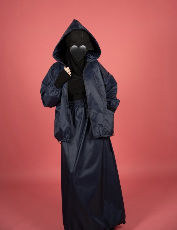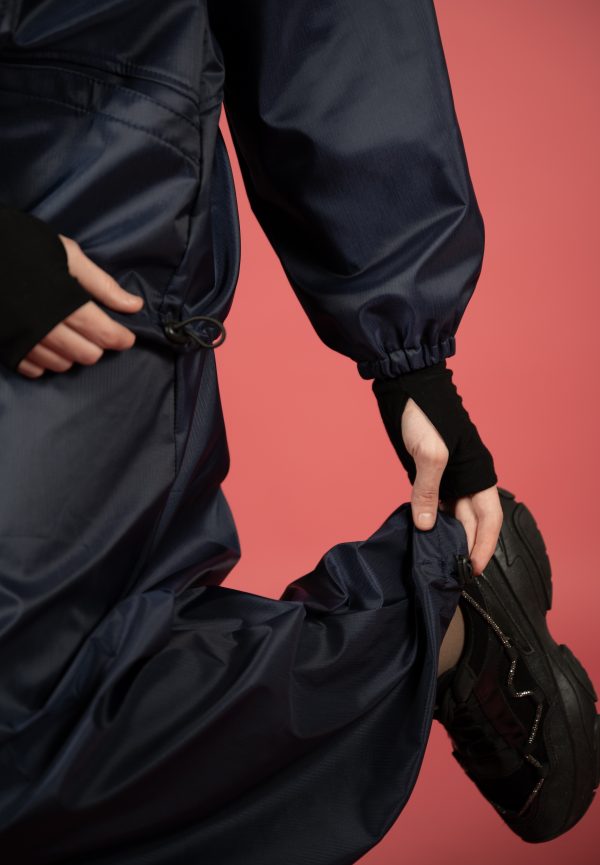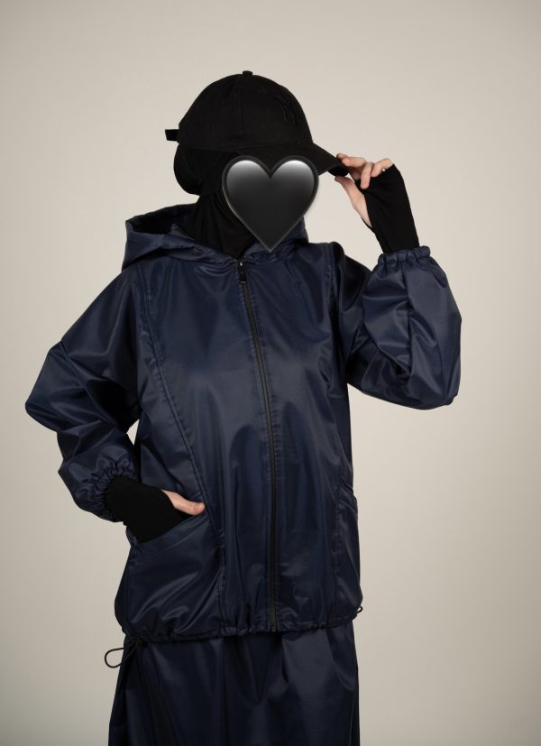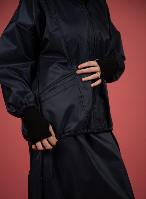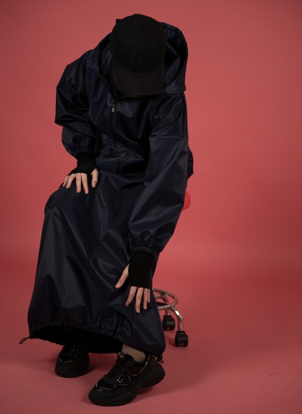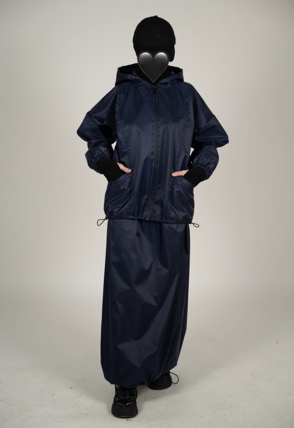 Përbëhet nga një xhaketë me kapuç dhe fund i gjatë me bel elastik, në material të lehtë, rezistent ndaj ujit dhe erës, perfekt për ditët e freskëta apo udhëtime aktive.